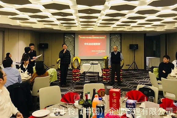 忘年会晚宴 中矢利久董事总经理(右中)致辞、营业部周骏副部长 (左中)同声传译