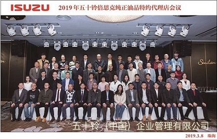 2019年3月8日,由五十铃(中国)企业管理有限公司主办、天津日石润滑油脂有限公司协办的2019年五十铃倍思克纯正油品特约代理店会议在广东省珠海市的珠海万悦酒店召开。来自全国各地的31家特约代理店的51位代表、来自主办方和协办方以及五十铃日本总部的人员出席了本次会议。